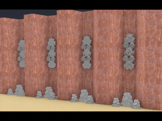 Rough surface textures. The surface finish of the printed structures encourages larval settlement and attachment by sessile organisms such as barnacles and algae.