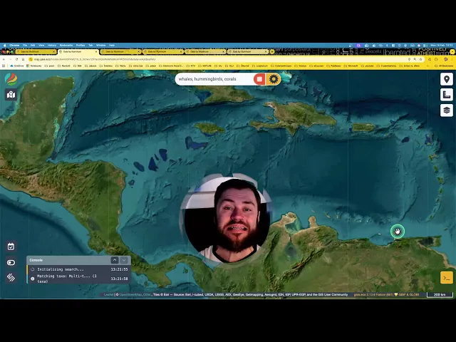 Behaviour: All specified taxa are resolved and their observation data is plotted simultaneously on the map. Each taxon group is visually distinguished. Users can mix broad taxonomic groups with specific species in the same query — for instance, combining "whales" (order-level), "Antillean crested hummingbird" (species-level), and "corals" (class-level) in one search.